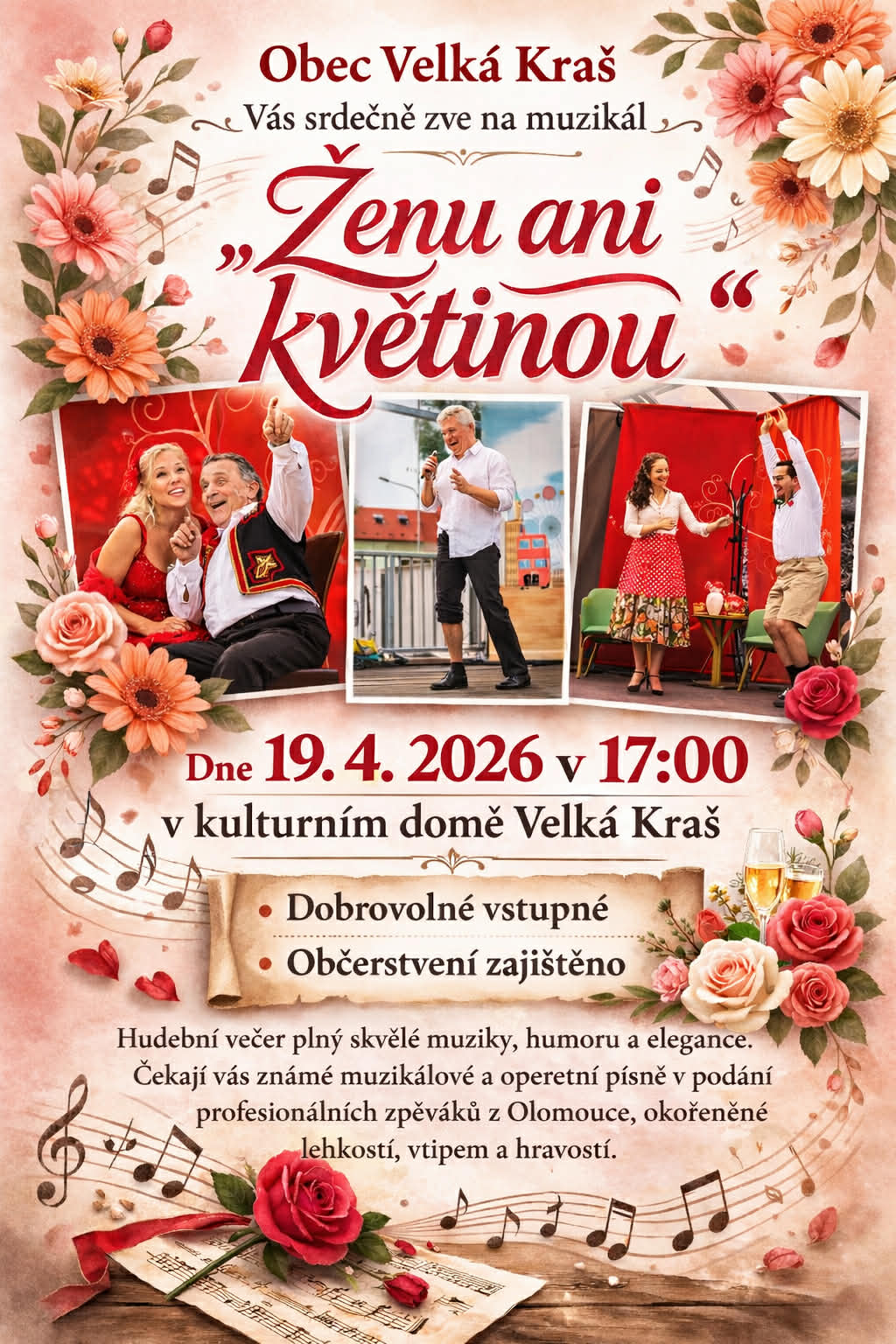 "Ženu ani květinou..." spojuje muzikálové a operetní melodie s vtipnými dialogy a scénkami.